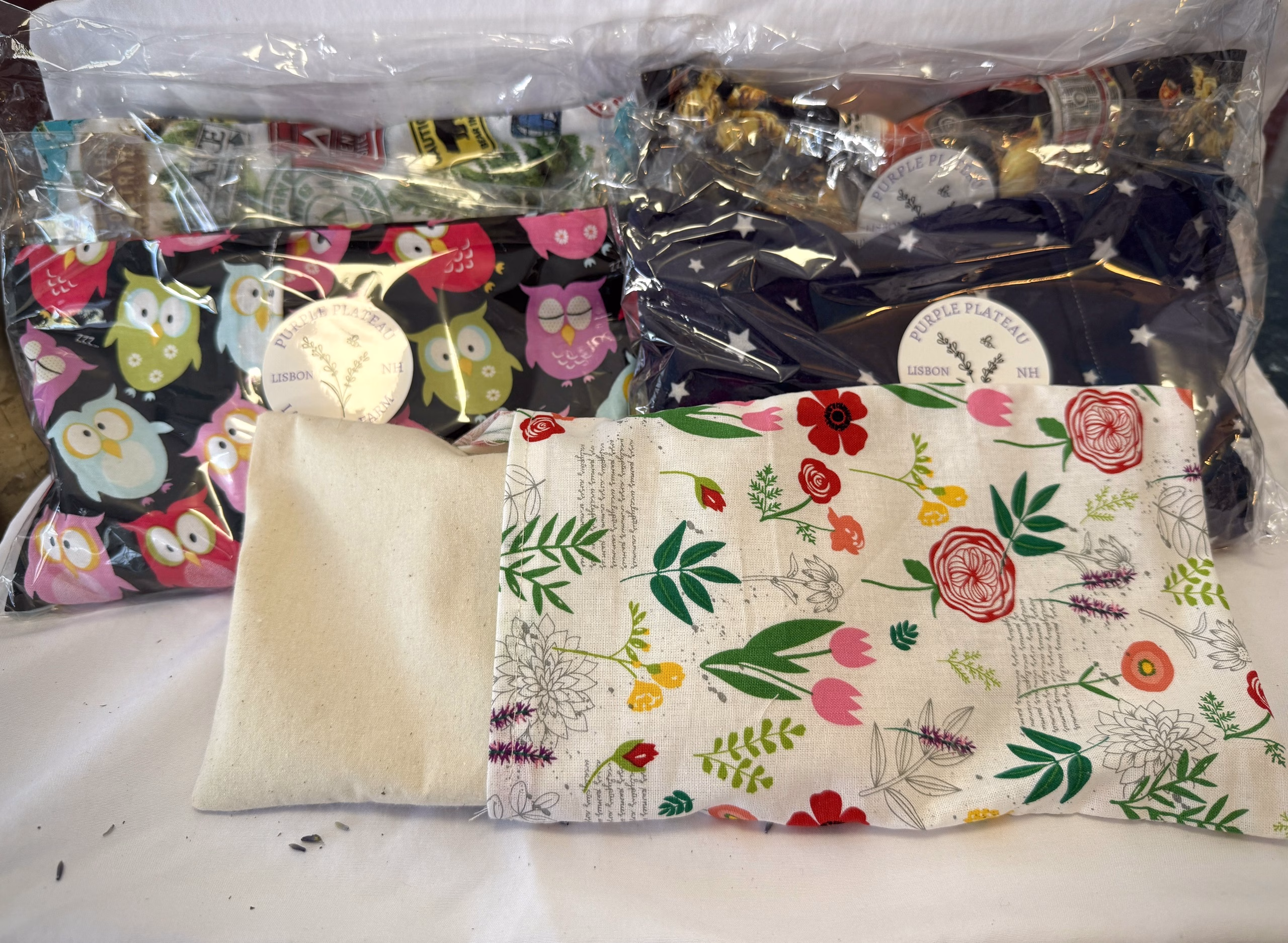 Hot and cold packs are made with 100% cotton outer and inner cover. They are approximately 5x9inches. Outer cover is removeable and washable. Pack is filled with rice and Lavender buds from our farm. Packs can be heated and used to relieve pressure from sinus headaches. Packs can also be placed in the freezer and used to relieved tired or sore muscles. We have a variety of patterns to choose from.